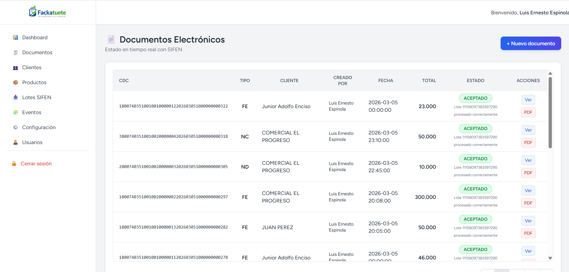 Fackatuete es una plataforma diseñada para simplificar la gestión de documentos electrónicos de tu empresa. Permite emitir Facturas Electrónicas, Notas de Crédito y Notas de Débito de forma rápida, segura y conforme a las normativas vigentes.